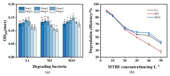 Three MTBE-degrading strains were domesticated by gradually increasing the initial concentration of MTBE from 5 to 50 mg/L in the culture with MTBE as the sole carbon source. The biomass of three strains at different MTBE concentrations is shown in Figure 1a. It was found that a higher biomass was obtained in the culture with MTBE concentrations of 10–30 mg/L. The growth of strains was stimulated at MTBE concentrations of 5–20 mg/L, while was suppressed at more than 40 mg/L, suggesting that MTBE at concentrations higher than 40 mg/L was toxic to strains and inhibited the growth. In contrast, the M3 strain had a higher biomass at lower concentrations (5–10 mg/L), and the M10 strain preferred to grow in a medium supplemented with high concentrations (30–50 mg/L) of MTBE. Consequently, the concentration of MTBE had a significant effect on the biomass of strains (p < 0.05).