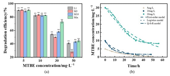 The comparison of the degrading capacity of pure strains and their mixture under different concentrations. (a) The efficiency of MTBE degradation by pure strains and their mixture. (b) Time course for MTBE degradation by mixed consortium and simulation results for three models. Symbols present the experimental data and curves show their statistic tendencies. ** represents p < 0.01.