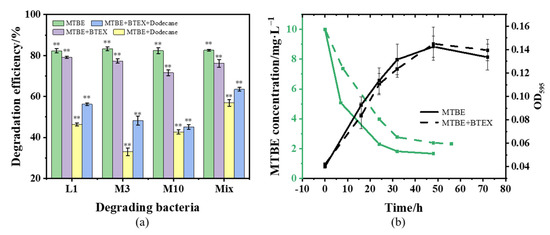 The individual and simultaneous removal of MTBE with other gasoline organic components is shown in Figure 3a, and the highest degradation efficiency was achieved by adding MTBE alone. In binary mixtures with BTEX, the degradation efficiency of MTBE was 5–10% lower, with a greater negative impact on the M10 strain. Furthermore, dodecane was unfavourable to MTBE removal with a 35–50% reduction of degradation efficiency, and M3 strain was more susceptible to dodecane. The addition of both alkanes and BTEX led to a reduction in MTBE biodegradation, and the effect of each substrate on MTBE removal decreased in the order of dodecane > BTEX. The significant differences in degradation efficiency of the experimental groups containing different carbon sources were verified by ANOVA (p < 0.01). One of the possible reasons was that three strains used in this study could utilize dodecane and BTEX as the carbon source for growth (Figure S1). Compounds with a higher affinity for bacteria were found to compete with MTBE for the action of enzymes to reduce the MTBE removal []. Moreover, it can be speculated that strains preferentially metabolized aliphatic hydrocarbons rather than ethers, which is consistent with previous studies.