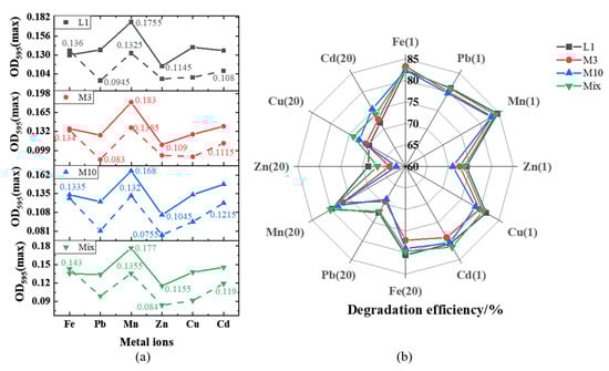 The capabilities of strains to degrade MTBE in the presence of metal ions (Fe2+, Mn2+, Pb2+, Zn2+, Cu2+, and Cd2+) detected in gasoline-impacted soils and water was investigated. The growth response of strains to six metal ions with different concentrations in a MSM medium containing MTBE as carbon source is presented in Figure 4a. As can be seen, the maximum biomass varied in the range of 0.1045–0.183 and 0.0755–0.143 for metal concentrations of 1 and 20 mg/L, respectively. At a metal concentration of 1 mg/L, the growth of strains exhibited similarity and there was no substantial change in the biomass of three tested metal ions (Pb2+, Cu2+ and Cd2+). In comparison, Zn2+ caused a sharp decrease in biomass, indicating that strains grew well in the presence of metal ions other than Zn2+ at concentration below 1 mg/L. Furthermore, the biomass decreased with increasing metal concentration, while the biomass treated with Fe2+ hardly changed. The growth of strains was inhibited by replacing essential ions or blocking the important functional group with the introduction of metal ions except for Mn2+ and Fe2+ at concentration up to 20 mg/L []. Under two test concentrations, the strains treated with Fe2+ and Mn2+ grew better, while Zn2+ had a stronger inhibitory effect on the growth of strains.
