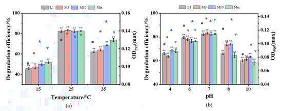 Tolerance of strains to temperature and pH. The growth of strains (scatter chart) and the yield of degradation (bar chart) carried out on various (a) temperature and (b) pH. ** represents p < 0.01.
