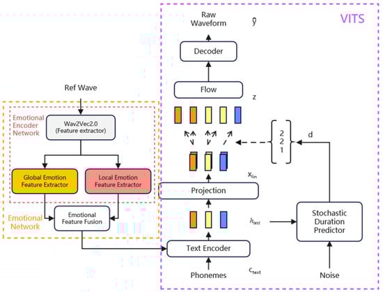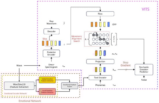 However, there are still some problems in the emotion embedding methods of speech synthesis. First of all, there is the problem of useful information loss in the two-stage transmission of parallel TTS. At present, the parallel speech synthesis algorithm is generally simplified into two stages. The first stage analyzes the input text information, generates the corresponding linguistic specification input, and predicts the spectrum waveform. In the second stage, according to the spectrum waveform provided by the speech analysis section, the corresponding audio is generated to realize the sound. In general, the modules of the two-stage model are trained separately, and there will be a certain gap between the spectrum generated in the first stage and the real spectrum. Therefore, when the spectrum generated in the first stage is applied to the second stage, this gap will be preserved, and the effective information will be lost in transmission, thus reducing the final audio synthesis effect. On the other hand, the training of the two-stage model is separate, so the connection relies on pre-defined intermediate features, which makes it difficult to learn the hidden representation directly from the previous stage to further improve performance []. A complete end-to-end model, on the other hand, does not require separate training, so it avoids these problems to some extent.