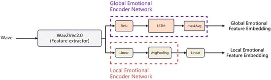 The global emotion encoder network in the figure processes the output features of wav2vec 2.0 through a linear layer with ReLU activation. Then, through the single-layer LSTM [], the culture is further improved. Finally, the feature sequences are aggregated into the mean vector representation after a certain step length by the MaskAvg module, and 192-dimensional global affective feature embedding is formed.