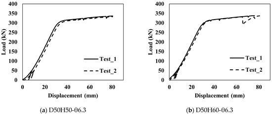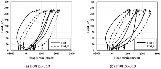 The load-displacement curve for each specimen is shown in Figure 5. When the load-displacement curves of all specimens are compared, as shown in Figure 5e, the behavior characteristics according to the configuration of the mono-anchor head cannot be discriminated, and it can be confirmed that only the dominant behavior appears in the strand. On the other hand, the results of strain measurement in the hoop direction measured to specify the behavior of the mono-anchor head are shown in Figure 6, according to the load applied to the strand. It can be confirmed that the individual strains attached to the same specimen show non-constant result values. This is considered to be the effect of the wedge placed inside the anchor head, and should be specifically considered through analysis when investigating the behavior according to the design variables of the anchor head.