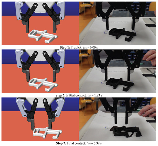 Figure 14 shows four steps in picking the selected object in the specific location and orientation: (1) prepick, (2) establishing initial contact with the robotic fingers, (3) reaching final contact, and (4) lifting of the object. In the event of the first pick-point, it can be seen that the gripper cannot pick the object successfully in simulation and on the physical test setup. The grasp score for the first pick-point is also low compared to two successful pick-points, indicating that the success metrics are calculated accordingly. Only in the last step are there minor differences between the simulated and the actual response due to the immediate lifting after establishing contact with the physical system. Therefore, the two figures do not match completely. Figure 15 shows contact forces at the described events for pick-point N1.