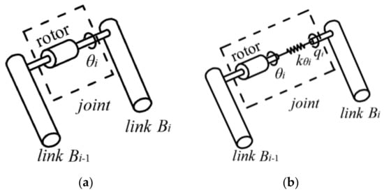 According to Spong’s simplified model of the “rotor-torsion spring system” [], in the case of small deformations, a flexible joint can be regarded as a linear spring with no moment of inertia between the motor rotor and the link. The structures of rigid joints and flexible joints are shown. Figure 1a is the rigid-joint, and Figure 1b is the flexible-joint. From Figure 1a we can see that the rotor’s rotation angle is equal to that of the link . Their rotation angles are all . However, the rotor’s rotation angle is and the link ’s rotation angle is in Figure 1b. So, there is an angle error caused by the spring: is the spring’s stiffness coefficient.
