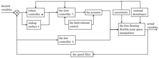 At the same time, we also consider that the actuator of the space robot may break down after long-term work. The specific performance aspects drive the failure. Especially in the harsh space environment, the probability of actuator failure is greatly increased. However, due to the limitation of physical conditions, and the high cost of raw materials and maintenance, maintenance of the actuator is quite difficult. Therefore, the space robot system requires strong fault tolerance. At present, some achievements have been made in the research of fault-tolerant algorithms [,,,,,,]. Wu [] developed an output-based adaptive neural-tracking control strategy for the considered system against an actuator fault. An observer is used to estimate the unavailable states. Li [] proposed a finite-time-command-filtered adaptive fault-tolerant control for a class of uncertain nonlinear systems. The control method is an effective method to compensate for the influence of an actuator fault in nonlinear systems; it can also guarantee the tracking performance and closed-loop stability of the system. However, most of the research objects are ground-based rigid robotic systems. They cannot be directly applied to the motion control of the space robot, and their joint flexibility is not considered. There are few studies on fault-tolerant control of space robots. Lei [] designed an adaptive fault-tolerant controller for space robot systems with uncertain parameters and local control failure of the joint actuator. The method can estimate and give feedback on the effective fault factors, so it does not require the definite value of the fault-effective factor. It is more suitable for practical engineering applications. Yu [] presented an adaptive sliding-mode fault-tolerant control method for a six-DOF space robot with flexible panels. This method can ensure that the space robot with the actuator fault reaches the predetermined position, and that it can suppress the vibration of the flexible plate. Lei [] proposed a hybrid controller consisting of a decentralized neural network fault-tolerant controller for a slow subsystem and a PD feedback controller for a fast subsystem. It can compensate unknown actuator faults and uncertain dynamics, obtain H convergence performance, and suppress residual vibration of the elastic base. Lei [] proposed an adaptive sliding mode fault-tolerant controller based on a fault observer. The fault observer can accurately estimate the gain faults. Yet the subject of this study is the rigid space robot system. The possibility of the existence of flexible joints in the robot structure is not considered.