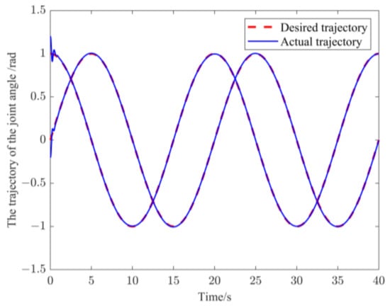 The comparison simulation results are shown in Figure 20, Figure 21, Figure 22 and Figure 23. The numerical comparison results of and under the two control methods are shown in Table 5. According to the results, we find that when an actuator has a serious fault, RBFTHC can also ensure that the system has good control quality. The motion trajectory of the joint angle of the system can still track the desired motion trajectory, and the vibration is suppressed. However, CTC cannot track the trajectory. The output error in CTC is 35 times larger than that in RBFTHC. The angle error in CTC is three times larger than that in RBFTHC. The excellent fault tolerance performance of RBFTHC is proved.