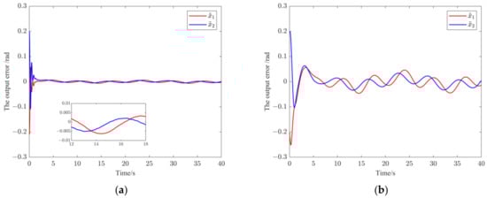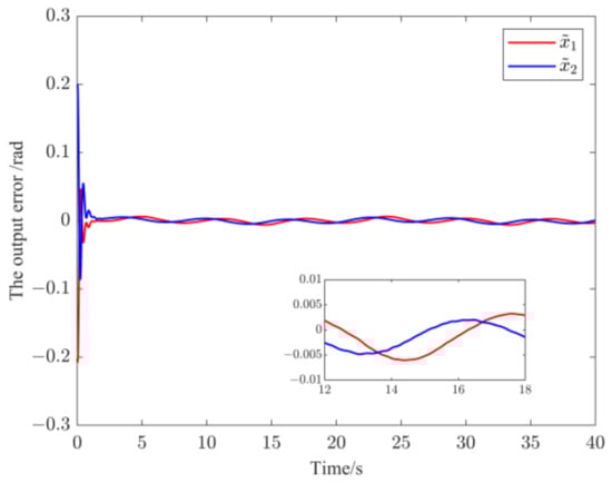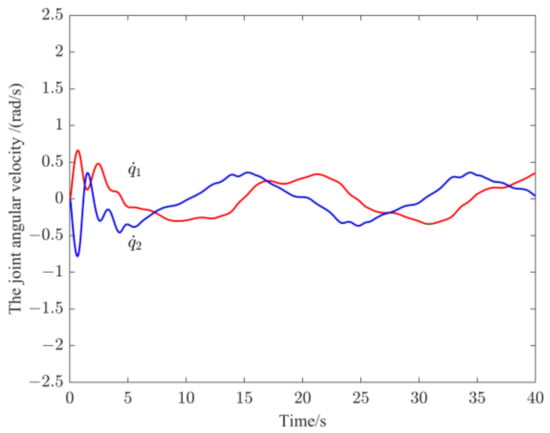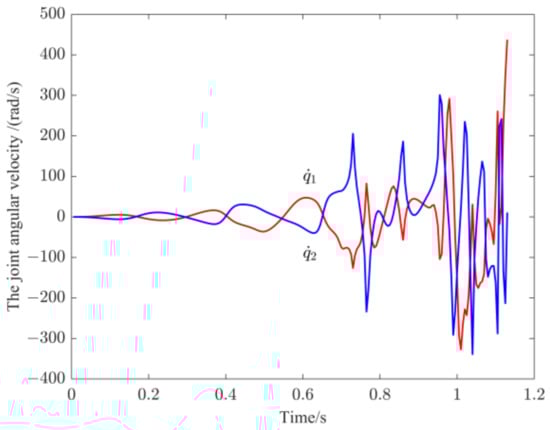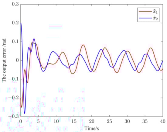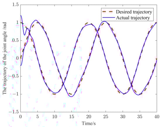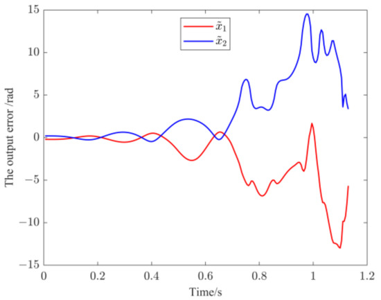 Case 2: To prove the control effect of the robust controller in RBFTHC, we turn off . The simulation results are shown in Figure 8, Figure 9, Figure 10 and Figure 11. From the results we can find that when is off, the tracking accuracy of the joint angle’s desired trajectory is not good. The output error becomes larger (from −116 to 70 rad) than the case of is on (from −6 to 3 rad). The system angle error becomes larger (from −5.8 to 10 rad) than the case of is on (from −1 to 7 rad). The observation of the joint velocity is not accurate. The reason for these results is that the uncertain parameters and the external disturbances of the system are not effectively compensated for. So, the simulation results prove that the proposed robust controller can compensate for the system’s uncertain parameters and external disturbances effectively.