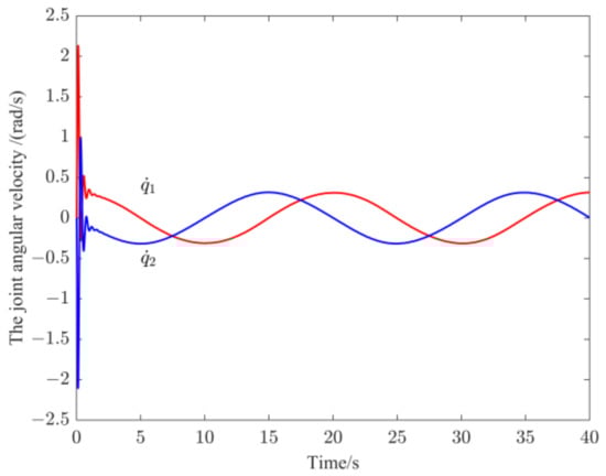 From Equation (8) we can see that when , the flexible-joint’s stiffness coefficient matrix . At this time, the connection between the motor rotor and the manipulator can be regarded as a rigid connection. , , , . Let in Equations (9) and (10), and the slow subsystem’s dynamic equation can be obtained: