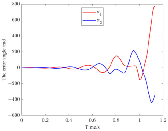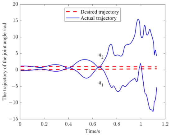 Case 3: In order to verify the control effect of the fast subsystem’s controller in RBFTHC, we turn off . The simulation results are shown in Figure 12, Figure 13, Figure 14 and Figure 15. At this time, the system-elastic vibration caused by the flexible-joint is not suppressed, so the joint angle trajectories have seriously deviated from the expected trajectories in only 1.2 s. The output error and the angle error were large. So, the control failed. The effectiveness of the proposed fast subsystem controller is verified. At the same time, the simulation results also prove that the strategy proposed in this paper, which uses a singular perturbation method to decompose the system and control the slow and fast subsystems separately, will be beneficial to the effective control of the strong rigid-flexible coupling system.