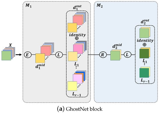 Recently, GhostNet [] has been proposed, which contains a Ghost module that can generate redundant feature maps at a low computational cost. The study [] introduces two components in deep neural networks: extracting intrinsic feature maps and linear transforming them. When extracting the intrinsic feature maps, the existing 1 × 1 convolution [] is used. Then, redundant feature maps are generated through a cheap linear transformation in the feature maps. It has become one of the representative light-weight models in that it contains a plug-and-play component that can replace the existing convolution layer and has the efficiency of extracting feature maps at a low computational cost.