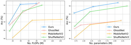 We first compared GhostNeXt with other light-weight models [,,] on small-scale datasets. We used GhostNeXt (1.0×) as our base model with the module configuration  representing the best trade-off between performance and computational complexity, based on experimental results in Section 4.4. Note that the module configuration  is constructed by the controller selecting E, R, and R channel operations for each part. In Table 3, GhostNeXt outperforms other competitors with fewer parameters and FLOPs for most computational complexity levels and tasks. It consumes about three times fewer parameters than GhostNet. We can see that dynamic module configuration not only reduces unnecessary computational costs inside the block but also improves the expressiveness of the network. Figure 2 shows the results on CIFAR-10 under different parameters and FLOPs. Regardless of the number of parameters or FLOPs, GhostNeXt outperforms all other models. While GhostNet cannot maintain the performance for a small number of parameters, GhostNeXt exhibits a better trade-off between the number of parameters and performance than GhostNet. Furthermore, since GhostNet has a high parameter count compared to its FLOPs, when comparing performance with models that have similar FLOPs, it is observed that its performance is comparable to that of ShuffleNetV2. However, when models are compared based on similar parameters, GhostNet performs worse than ShuffleNetV2. In contrast, GhostNeXt shows the best trade-off among all models, indicating its flexibility in handling resource constraints. These results suggest that GhostNeXt is a promising alternative to the compared approaches for various applications that require efficient and accurate image classification.
