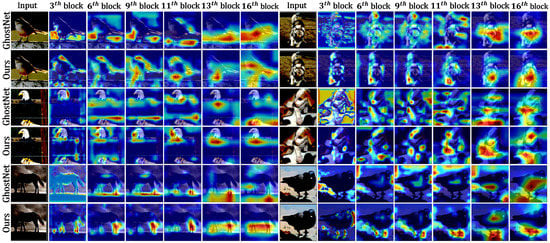 We also experimented with demonstrating that the dynamic module configuration preserves the key feature of an image. We empirically prove this by providing a visualization of the output features of six different blocks using Grad-CAM []. We make notable observations from the results in Figure 3. GhostNet loses significant feature information. It primarily focuses on the background in the early layers and the object in the deep layers. In contrast, the proposed method can preserve meaningful information about object shapes from the early layer. It continuously preserves the meaningful shape information of an object throughout the network and thus gains additional performance improvement.
