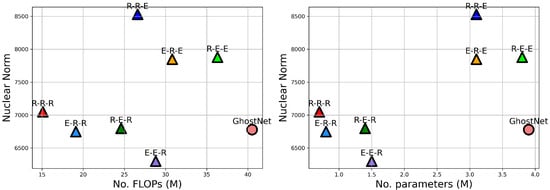 Visualization of the nuclear norm with respect to parameters and FLOPs on CIFAR-10.