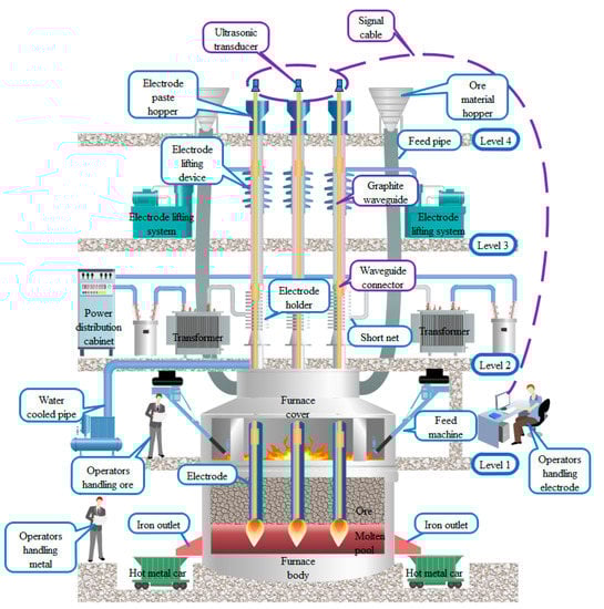 Submerged arc furnaces are critical pieces of metallurgical equipment used for ferroalloy smelting. Ferroalloy produced by submerged arc furnaces comprises more than 80% of their total production []. Electrical energy is delivered into the furnace through an electrode during the smelting process. The arc heat at the electrode end and the resistance heat between the material or slag to are used to melt and reduce the ore []. Therefore, the depth electrodes inserted into the charge directly affects a furnace’s power consumption and melting temperature distribution []. The operator adjusts the depth of the electrode inserted into the charge by raising and lowering the electrode. However, the furnace temperature can reach up to 1350 degrees, and the electrodes are deeply buried in the charge. Therefore, measuring the depth of the electrodes into the charge is a significant challenge for many researchers.
