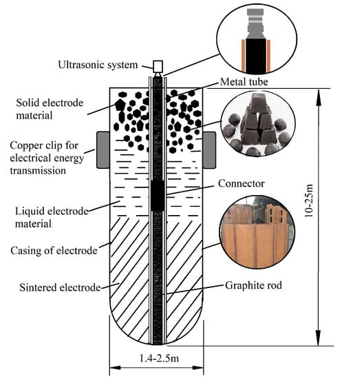 Figure 1 shows the principle of the three-phase electrode system of submerged arc furnaces. The electrical energy is delivered into the furnace through the electrode. The arc heat at the electrode end and the resistance heat between the material or slag are used to melt and reduce the ore []. During the smelting process, the molten metal is increased by the melting of the ore, and the electrodes are consumed by corrosion. Therefore, it is necessary to raise and lower the electrode to adjust the position of the electrode ends so that the furnace maintains the proper smelting temperature []. However, because of the extremely high temperature in the furnace, there still needs to be suitable measurement techniques to determine the position of the electrode’s working end []. In addition, because of mechanical stress and thermal deformation, cracks may occur in the electrode during the smelting process. If these hidden cracks are not found in time, serious accidents can easily be caused. In this paper, the method we considered was the use of ultrasonic-guided waves to detect the position of the electrode’s working end and the hidden cracks in the electrode. However, the critical basis for using ultrasonic-guided wave technology is that there is a channel suitable for ultrasonic propagation in the electrode.
