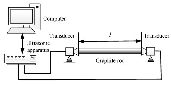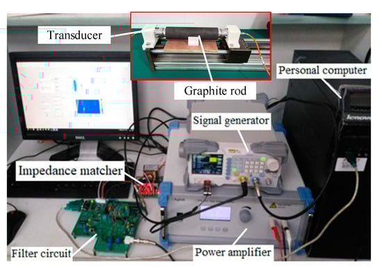 At room temperature, we placed the graphite electrode sample between two Langevin transducers (as shown in Figure 4). At the beginning of the measurement, the signal generator output a sinusoidal signal with a predetermined frequency and then amplified the signal through a power amplifier, which used an impedance matcher to drive the transmitting transducer to work. At the same time, the data acquisition card was triggered by the external clock to record the signal received from the receiving transducer and save it to the PC. The number of received signal sampling points was 512, and the sampling period was 0.4 microseconds. To reduce the interference noise in the received signal, we used a low-pass filter circuit to filter the output of the receiving transducer.