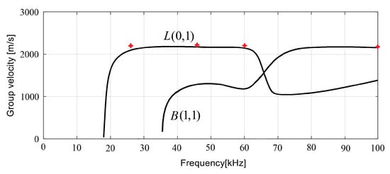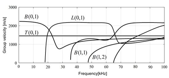 - Near the cutoff frequency of the L (0, 1) longitudinal mode, there was a frequency range with a small degree of dispersion, and the L (0, 1) mode had the largest group velocity in this frequency range. In summary, the group velocity of the L (0, 1) mode was larger than that of other modes in the range of its low-frequency dispersion frequency. This means that the L (0, 1) mode signal will reach the transducer first.