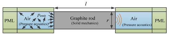 To understand the propagation of sound waves in the graphite rod, we established a steady-state finite element model in the frequency domain in COMSOL. We used this model to analyze the transmission characteristics of ultrasonic waves with different frequencies between 25 kHz and 100 kHz. The model was established based on the sound transmission loss measurement standard []. The finite element model consists of a source room, a receiving room, and a graphite rod, as shown in Figure 6. The left is the source room, and the right is the receiving room. Both the source room and the receiving room are filled with air. We set the surroundings of the sound source room and the receiving room as a perfect matching layer (PML) to simulate the infinite air domain. The thickness of the perfect matching layer was set as the maximum wavelength. We used pressure acoustics, solid mechanics, and acoustic–structure coupling boundaries in the model. The sound source room and the receiving room were set as pressure acoustics. The graphite rod was set as the solid mechanic. The graphite rod material was set to conform to linear elastic behavior. The attenuation of ultrasonic waves in graphite was simulated by adding an isotropic loss factor in the material properties. We used the cantilever beam resonance method [] to measure the isotropic loss factor of graphite, which is 0.012. The boundary between the fluid and solid domains was set as the acoustic–structure coupling boundary, which simulates the coupling between pressure acoustics and solid mechanics.