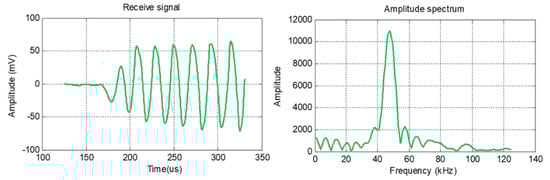 Figure 8 shows the time and frequency response of the received signal in a 400 mm sample. The ultrasonic velocity in the graphite rod was 2275 m/s when the working frequency of the transducer was 25 kHz, 47 kHz, 60 kHz, and 100 kHz, respectively; the ultrasonic velocity in the graphite rod changed by only 2%, which is within the measurement error.