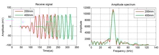 When ultrasonic waves pass through the medium, the lattice structure will absorb part of the energy and reduce the wave amplitude. This attenuation is caused by the type of material, small holes, and small cracks. For long-distance measurements, attenuation is a major problem. Therefore, it is necessary to study the transmission loss of ultrasonic waves in graphite rods. This paper used Equation (7) to calculate the transmission loss. Figure 9 shows the time and frequency response of the received signal with a frequency of 47 kHz in different long test samples.
