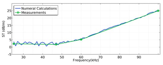 As shown in Figure 11, the transmission loss of ultrasonic waves with different frequencies was calculated by Equation (5). The blue curve in Figure 11 results from numerical simulation, and the green curve is the result of experimental measurement. Although the simulated transmission loss (shown by the blue curve in Figure 11) exhibited fluctuations, it does not mean that the solutions did not converge. This is because we defined the sound field of the sound source room as the sum of N uncorrelated plane waves moving in random directions. As shown in Figure 12, there was an expected significant fluctuation at low frequencies where the wavelength was comparable to the rod diameter, because at low frequencies, sound waves cannot diffuse effectively. This means that the sound field will not diffuse under the measurement conditions under these low frequencies.