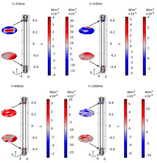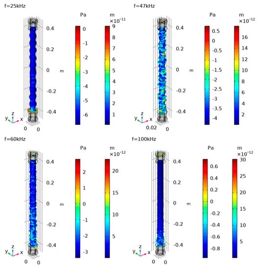 The incident intensity and transmitted intensity in the graphite rod surface are shown in Figure 13. The ultrasonic wave frequencies were 25 kHz, 47 kHz, 60 kHz, and 100 kHz. It can be seen from Figure 13 that the incident intensity distribution was only related to the randomness and the number of plane waves N in Equation (2). The transmitted intensity was determined by the sound pressure and displacement at the receiving end of the graphite rod. The displacement is related to the transferable modes in the graphite rod. The sound pressure and displacement at the receiving end of the graphite rod are shown in Figure 14.