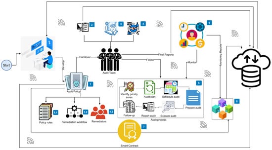 Organizations rely heavily on SA because they check to see whether a software product or process is compliant with rules, norms, and policies. In contrast, BCT may cause a major shift in the auditing and controlling industry. In this part, we propose the SSFTA framework to offer a smart and secure audit procedure, bearing in mind the significance of both audit and BCT. Figure 3 provides a pictorial overview of SSFTA. According to SSFTA, software organizations create audit policies that include remediation procedures, remediators, and policy rules where particular breaches are defined by policy regulations. When an audit scan finds a breach of a policy rule, the remediation procedure is initiated, and remediators are appointed users with the authority to address the violation. Remediators can be a single user or a group of people appointed to address security violations. These policy rules are stored in the private cloud from which authorized persons can access them. Once the policy rules are defined, they are documented using a smart contract so that they may be immutable. Once the organization decides to conduct IA or external audit (XA), these policy rules are shared with the audit team.
