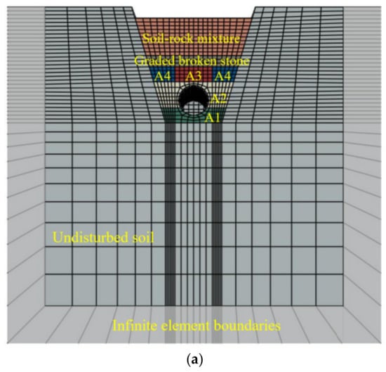 In the model, the slope of the trapezoidal ditch was 1:0.33, the width of the bottom of the ditch was 1.5 m, the height to earth up was 2.1 m, the bottom of the ditch was made of a 200 mm thick cushion (A1), and the supporting angle of the foundation of the bottom was 120°. A2 was the backfill on the side of the pipe, A3 was the backfill on the top of the pipe, and A4 was the soil on both sides of A3. To prevent the reflection of vibration energy by fixed boundary in Abaqus dynamic analysis, which may cause errors, the model boundary adopted an infinite element boundary to simulate the far-field infinite soil [,]. The size of the model was set to 8 m × 9 m × 20 m, as shown in Figure 10. According to the study by George et al. [], the soil outside the three-fold pipe diameter has little influence on the soil of the flexible pipe, so the size used in the model is reasonable. In order to improve the calculation accuracy, the backfill in the trench was divided into smaller elements. Before determining the element size, several comparisons were made. The results show that when the element size of backfill soil was less than 0.04 m × 0.04 m × 0.1 m, the simulation results were almost not affected by the element’s size. Therefore, the maximum size of the backfill element was set to 0.03 m × 0.03 m × 0.07 m. The constitutive relation of soil adopted the classical Mohr-Coulomb constitutive. According to the compaction degree and physical properties of the soil at different positions, the material models such as Young’s modulus, internal friction angle, and cohesion were obtained by referring to the relevant specifications [,], as shown in Table 4. The implicit method was used in the model.
