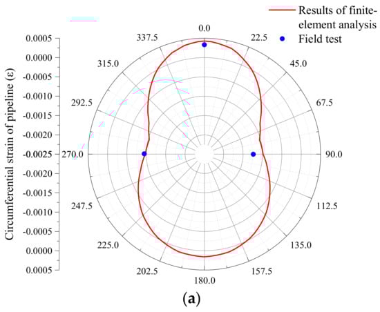 The circumferential strain of pipeline obtained by finite-element analysis and field tests: (a) Condition 1, (b) Condition 2, and (c) Condition 3.