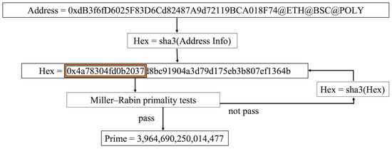 The identity authorization of the wallet account in the scheme is realized by using the RSA accumulator. First, the authorized blockchain scope is added to each wallet account as a suffix. They are then mapped to prime numbers and added to the accumulator value. The accumulator value is associated with the user’s admin account through the IDNFT contract. The user proves the correspondence between the wallet account and the identity by showing the membership witness of the prime number corresponding to the wallet account in the accumulator. This section is divided into two parts: the first part explains how to map a wallet account to a prime number. The second part describes the construction of the RSA accumulator. The scheme uses Josh Benaloh and Michael de Mare’s approach to construct RSA accumulators.