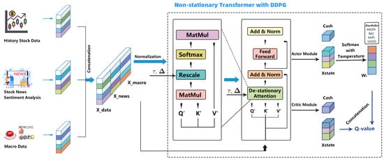 This study enhances portfolio management by integrating DRL with macroeconomic modelling, utilising insights from macroeconomic factors and sentiment analysis from news data. The proposed method employs a non-stationary transformer, as shown in Figure 1, further augmented by a model-free, off-policy actor-critic algorithm - the deep deterministic policy gradient (DDPG) algorithm []. In this framework, “X_data” represents the historical stock data, “X_news” denotes the sentiment-analysed news information, and “X_macro” signifies macroeconomic indicators, such as GDP, CPI, and unemployment rates. These diverse data streams are concatenated and normalised before input into the transformer. Within the transformer, “Q”, “K”, and “V” denote the transformed “queries”, “keys”, and “values”, respectively, in the self-attention mechanism. These components are critical for adapting the model to the non-stationarity in financial time series by recalibrating attention in response to the dynamic changes in the data. The actor and critic modules in the DDPG framework use the transformer’s output to make decisions about asset allocation, optimising the portfolio performance.