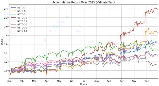 In Figure 2, the analysis of cumulative returns for the validation dataset across varying window lengths reveals the strategic influence of the chosen time frame. An intriguing periodic decline in at the end of each month is observed, which may reflect routine market occurrences such as settlement cycles. The 10-day window (NSTD-10), marked in red, consistently surpasses other strategies from mid-year to year-end, indicating that a 10-day span effectively leverages historical data to inform current market predictions. Shorter windows like the 3-day (NSTD-3) and 5-day (NSTD-5) show early promise but later falter, suggesting they may be too narrow to grasp the larger cyclical movements of the market that a 10-day window encapsulates. Conversely, the longer window strategies—NSTD-30 and NSTD-50—demonstrate smoother return trajectories but do not achieve the higher returns seen with NSTD-10. This implies that while longer windows provide a broader historical context, potentially capturing more extended market cycles, they may lack the agility to capitalise on immediate market shifts. The 10-day strategy emerges as the most effective, balancing immediate market reactivity with understanding broader market movements, highlighting its efficiency for this period.
