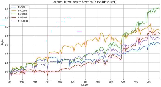 In Figure 3, the cumulative returns for the validated dataset are mapped out across different temperature coefficients (T) on portfolio performance. The parameter T influences the dispersion of stock weights within the portfolio, with higher T values promoting diversification and lower values indicating concentration. Portfolios with T = 5000 and T = 10,000, respectively, demonstrate a marked increase in cumulative return, especially noticeable from mid-year onward, with T = 10,000 displaying a pronounced uptick as the year concludes. This trend suggests that higher temperature settings, while promoting a more balanced weight distribution across the portfolio, may also enable the capture of growth opportunities in a rising market, contributing to higher overall returns. Conversely, the T = 500 and T = 1000 settings indicate a preference for a more concentrated portfolio. While this strategy may yield higher short-term gains by focusing on a limited number of stocks, it also introduces heightened risk, as the portfolio is more vulnerable to the volatility of its few constituents. These lower T values produce more modest growth throughout the year, with occasional dips reflecting the increased risk exposure. The T = 3000 setting balances the two extremes. Portfolios with this temperature setting deliver steady, consistent growth over the year, suggesting that a moderate T value can effectively balance the benefits of diversification with the potential gains from a more focused investment strategy. Overall, the temperature parameter’s calibration is crucial for managing risk and capturing growth within a portfolio.
