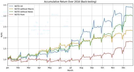 After obtaining the optimal hyperparameters, we tested our model based on different features in 2016 (test set). The comprehensive NSTD-10 includes macroeconomic indicators, sentiment-derived news scores, and historical stock trading data. The NSTD without Macro excludes macroeconomic indicators while retaining news scores and historical data. The NSTD without News removes news scores featuring macroeconomic indicators and historical data. The NSTD Pure is the most pared-down, solely comprising historical stock trading data.