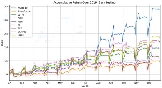 In demonstrating the superior performance of the NSTD-10 model, we conducted extensive backtesting analysis over 2016 and compared it with deep learning architectures, such as the transformer, RNN, LSTM, and GRU, as well as state-of-the-art EIIE and EI, together with traditional financial algorithms like online moving average reversion (OLMAR) and the universal portfolio algorithm (UBAH). The evaluation hinged on critical financial metrics: annual return (AR), maximum drawdown (MDD), Sharpe ratio, and Sortino ratio. The analysis depicted in Figure 5, when considered alongside the quantitative metrics from Table 2, offers a nuanced assessment of various model performances. The NSTD-10 model emerges as the frontrunner, boasting an annual return (AR) of 3.353, indicative of its effective market trend utilisation for optimal capital increase. Its Sharpe ratio of 1.859 and a notably high Sortino ratio of 282.140 reflect its adeptness at securing returns per unit of risk, with a pronounced efficiency in mitigating downside risk. Delving into the NSTD model variations, the omission of news sentiment analysis (NSTD without News) results in a slight decrease in AR to 3.000 and a marked reduction in the Sortino ratio to 78.099, highlighting the significant contribution of sentiment data to forecasting precision and risk-adjusted returns. Excluding macroeconomic indicators (NSTD without Macro), we see a reduced AR of 2.311. However, it attains the lowest maximum drawdown (MDD) at 0.158, signifying macroeconomic insights’ protective role against market downturns. The NSTD Pure variant, which solely incorporates historical trading data, reiterates the value of a diversified data approach, as evidenced by its lower metrics across the spectrum. Compared with established deep learning models such as the transformer, RNN, LSTM, and GRU, these models exhibit commendable results but do not match the NSTD-10’s superior standards. Specifically, the LSTM model’s high Sharpe ratio of 1.824 underscores its strength in handling time-series data. Nevertheless, this does not correlate with a high AR or Sortino ratio, pointing to potential limitations in market dynamics adaptation. The ensemble approaches EI, and EIIE offers more consistent returns. However, their Sharpe and Sortino ratios fall short of those achieved by NSTD-10, suggesting that while reliable, they may not optimise the balance between risk and return. Traditional financial methods such as OLMAR and UBAH maintain stable risk management but lack NSTD-10’s efficacy in capitalising on market conditions. Overall, the NSTD-10 model’s unmatched performance in terms of overall returns and risk management sets a new standard in portfolio management. It underscores the strategic benefit of integrating comprehensive market data, from economic indicators to sentiment analysis, within a sophisticated algorithmic framework.