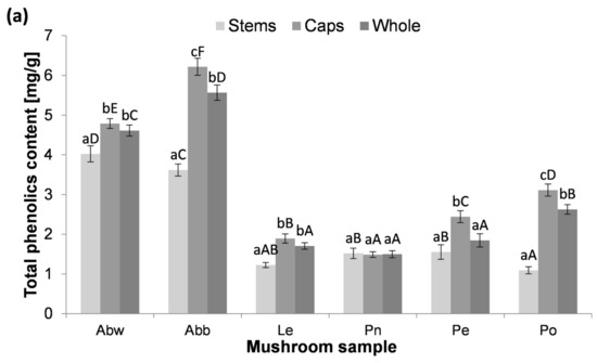 Flavonoids, belonging to the polyphenols, are commonly found in nature as dyes. Their presence has also been found in mushrooms. The content of flavonoids per gram of dry weight of the fruiting bodies is shown in Figure 2a. Among the whole fruiting bodies, the lowest concentrations were noticed in P. ostreatus and P. eryngii (0.47 ± 0.02 mg/g and 0.51 ± 0.04 mg/g, respectively), while the highest were in A. bisporus (brown) followed by A. bisporus (white) (1.84 ± 0.04 mg/g and 1.64 ± 0.04 mg/g, respectively). The results of A. bisporus support the previous findings in which their flavonoids level was recorded at ~1.7 mg/g [30]. On the other hand, Palacios et al. [23] reported similar amounts of flavonoids in A. bisporus and P. ostreatus (approximately 1 mg/g).