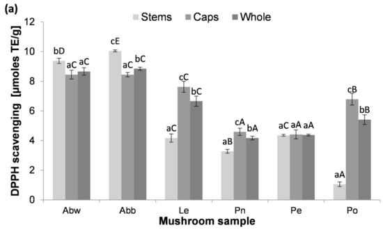 DPPH scavenging activity calculated per one gram of the extracts is shown in Figure 5b. The most striking result to emerge from the data is that the extract from P. ostreatus caps displayed exceptionally high potential (48.45 ± 1.85 µmoles/g) compared to other species. Taking into account that the extraction yield of the P. ostreatus caps was the lowest among the samples, this suggests that this extract contains the highest quantity of antioxidant compounds per gram. On the contrary, the lowest activity levels were exhibited by the P. ostreatus stems (3.57 ± 0.53 µmoles/g) followed by the P. nameko stems (8.79 ± 0.53 µmoles/g), P. eryngii stems and caps (10.85 ± 0.08 µmoles/g and 11.53 ± 0.95 µmoles/g, respectively), L. edodes stems (16.34 ± 0.84 µmoles/g) and finally, the caps of the white A. bisporus (21.06 ± 1.38 µmoles/g) and the brown A. bisporus (21.52 ± 1.28 µmoles/g).