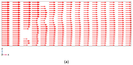 Comparing Figure 6a,b, we note that the flow separation for the partially lowered configuration is significantly larger than the fully lowered configuration of the sub-screen. The sub-screen creates a high drag because it is in front of the main screen. Consequently, a large amount of fluid is directed below the lifted sub-screen, inducing an intense flow separation between the upper and lower regions of the sewage channel. The flow separation in the partially lowered sub-screen traverses until the end of the channel compared with the fully lowered sub-screen, in which the flow is uniform over the channel cross-section at the end of the channel. The effect of this flow separation on the components at the inlet of the WTP can be clarified in Figure 7a,b, which depict the arrows for the magnitude of the x-component of the velocity for the fully and partially lowered configurations of the sub-screen, respectively. The shorter arrows indicate slower flow, and the longer arrows indicate faster flow. These arrows are plotted over the longitudinal vertical plane y = 0.1 m. The velocity along the x-direction is fairly uniform over the channel cross-section at the end of the channel when the sub-screen is fully lowered. However, the x-component of the velocity assumes separation over the channel height towards the end of the channel. This phenomenon suggests an uneven stress distribution on the components at the inlet of the WTP, which should be established to account for this uneven stress distribution.