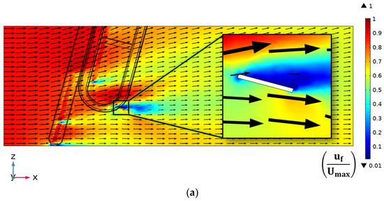 Normalized velocity contour plots at y = 0.1 m for an inlet velocity of 0.2 m/s when the rake is operational and (a) φr = −75°; (b) φr = 0°; the view of the rake has been magnified, and the arrows represent the velocity magnitude at the trailing points.
