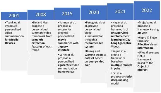 Milestones in personalized video summarization ([] (2001), [] (2008), [,] (2015), [,] (2020), [,,] (2021), [,,] (2022)).
