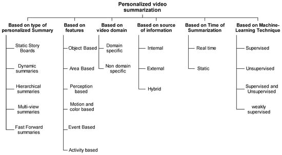 Many techniques have emerged to create personalized video summaries with the aim of keeping the exact content of the original video intact. Based on the characteristics and properties, the techniques are classified into the following categories that are depicted in Figure 4.