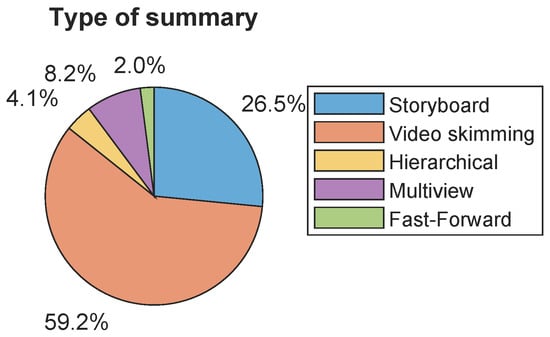 Figure 5 shows the distribution of the papers reported in Table 1 according to the type of feature of the personalized summary. From this distribution, it is depicted that personalized summaries with a percentage of around 59% are of video skimming type. Next in the ranking are the papers whose personalized summaries are of the storyboard type, with a percentage of around 27%. At a percentage of around 8%, there are works whose personalized summaries are the multiview type. The number of works whose personalized summaries are of the hierarchical type is half that of multiview type since their percentage is around 4%. The smallest number of works is those whose personalized summaries are of the fast forward type, at only around 2%.