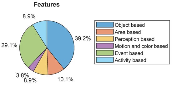 The distribution of the papers reported in Table 1 is shown in Figure 6 according to the type of features of the personalized summary. According to the distribution, most tasks perform a personalized object-based summarization at a percentage of around 39%. With a difference of 10% and a percentage of around 29%, those tasks follow in which the personalized video summary is event-based. Next, we have the tasks whose personalized summary is an area based on a percentage of around 10%. In fourth place are personalized perception-based and activity-based summaries with the same number of tasks and with a percentage of around 9%. The smallest number of works is the one with a percentage of around 4%, whose abstract is based on motion and color.