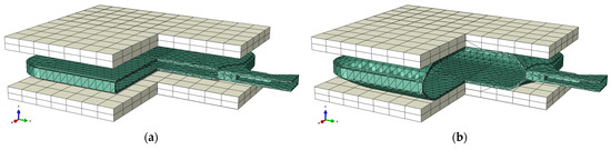 The hot water bottle was meshed with single-layer C3D10H hybrid 10-node tetrahedral elements, and the mild steel plates were meshed with double-layer C3D8H hybrid 8-node elements, as shown in Figure 6. The hot water bottle model was built with 17,694 nodes and 8934 elements, while each mild steel plate had 18,123 nodes and 9174 elements. The numbers of elements and layers were selected based on a mesh conversion study where different configurations were tested, and the first converged number was chosen. The values of von Mises stress at the intermediate nodes on both side edges of the bottle were used as a measure of continuity [15]. These analyses determined how small the elements should be to ensure that the mesh size did not affect the FE outcomes. The hot water bottle material model was constructed based on the material tensile test, where the particle swarm optimisation (PSO) algorithm [16,17,18] (MATLAB’s Global Optimisation Toolbox) was used to fit experimental tensile testing data to the Ogden nonlinear material model, as shown in Figure 7. The swarm size was set to 40 with an initial span of 2000, and the maximum number of iterations was set to 103 with a lower bound of changing the objective function’s value of 10−6 tolerance during a single step, based on preliminary investigation [19]. The lower limits of the Ogden material model parameters and were set to 10−6 and 0, while the upper limits were set to 10 and 50, respectively. These limits were selected based on the past practice of getting a decent mathematical fit while keeping the optimised solution within the numerical value range that does not cause FE model instability. The error was minimised between the fitted stress–strain data and the experimentally measured data via the objective function () which was set as follows: