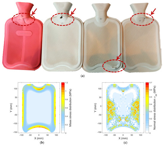 FE modelling was utilised to simulate the stress and strain distributions within the rubber material of hot water bottles under compression, providing insights into potential failure points and design vulnerabilities. Experimental validation involves uniaxial loading compression tests, offering tangible insights into the bottles’ real-world behaviour under pressure. However, loading was uniaxial; the hot water bottle material appeared to be subjected to a multiaxial stress state, with magnitudes and directions depending on the location in the bottle. It was clear that multiaxial stress appeared in the bottleneck and edges, where failure often occurs, and this was reflected in the von Mises stress as a measure of distortion energy density. The load–displacement curves derived from these tests reveal crucial mechanical responses, with variations attributed to intrinsic material properties, structural features, and manufacturing intricacies.