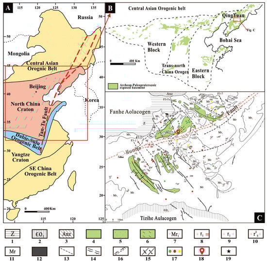 (A) The distribution of the basement in the North China Craton. (B) The distribution of Archean–Paleoproterozoic exposed basement in the North China Craton. (C) The regional geological map of the Qingyuan Greenstone belt (modified after Fengjin Yu et al. 2005 []). Legends: 1, Sinian System. 2, Cambrian–Ordovician. 3, Liaohe Group. 4, Nantianmen Formation. 5, Shipengzi Formation. 6, Hongtoushan Formation. 7, Mixed granite. 8, Charnockite. 9, Flake and gneissic mixed granite. 10, Granite. 11, Granite migmatite. 12, Remote sensing interpretation area. 13, Large-scale linear structure. 14, Secondary linear structure. 15, Geological boundary. 16, Presumed lithofacies Boundary. 17, Copper (green points) iron (red points) gold (yellow points) ore deposits (points). 18, Position of Hongtoushan VMS deposit. red 19, The location of Beijing.