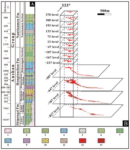 (A) Stratigraphic column of Hongtoushan VMS deposit (after Fengjin Yu, (2005) []); (B) Stereoscopic map of the ore body of the Hongtoushan VMS deposit (modified by Zhang, 2010 []). Legends: 1. Granitization granite; 2. Amphibole plagioclase leptynite; 3. Crush zone; 4. Biotite plagioclase gneiss; 5. Marble; 6. Biotite amphibole gneiss; 7. Amphibolite; 8. Garnet anthophyllite biotite gneiss; 9. Garnet anthophyllite gneiss; 10. Biotite quartz gneiss; 11. Garnet biotite plagioclase gneiss; 12. Massive ore; 13. Disseminated ore.
