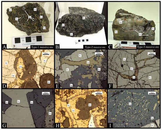 (A) Type-1 massive ore. (B) Type-2 massive ore. (C) Type-3 massive ore. (D) In Type-1 massive ore, the pyrite porphyroblasts including rounded or ellipsoidal quartz, chalcopyrite and sphalerite occur in a matrix, with some chalcopyrite filling the fractures of pyrite porphyroblasts and the margins of the quartz. (E) In Type-1 massive ore, pyrite porphyroblast is in a matrix of pyrrhotite, chalcopyrite and sphalerite. (F) In Type-2 massive ore, chalcopyrite and a small amount of sphalerite is distributed along the boundaries of the pyrite porphyroblasts. (G) In Type-2 massive ore, the contact line between sphalerite (Sp) and pyrrhotite (Po) is straight. (H) In Type-3 massive ore, crushed pyrite in the chalcopyrite matrix and sphalerite precipitates along the edges of the quartz, with some spheroidal quartz merging. (I) In Type-3 massive ore, the chalcopyrite disease textures include: chalcopyrite showing fine grains, blebs, dots, and a dust-like texture in sphalerite. Mineral abbreviations: Cp, chalcopyrite; Po, pyrrhotite; Py, pyrite; Qz, quartz; Sp, sphalerite.